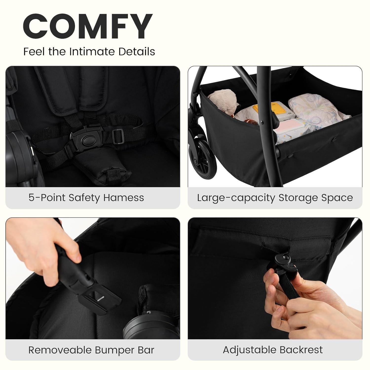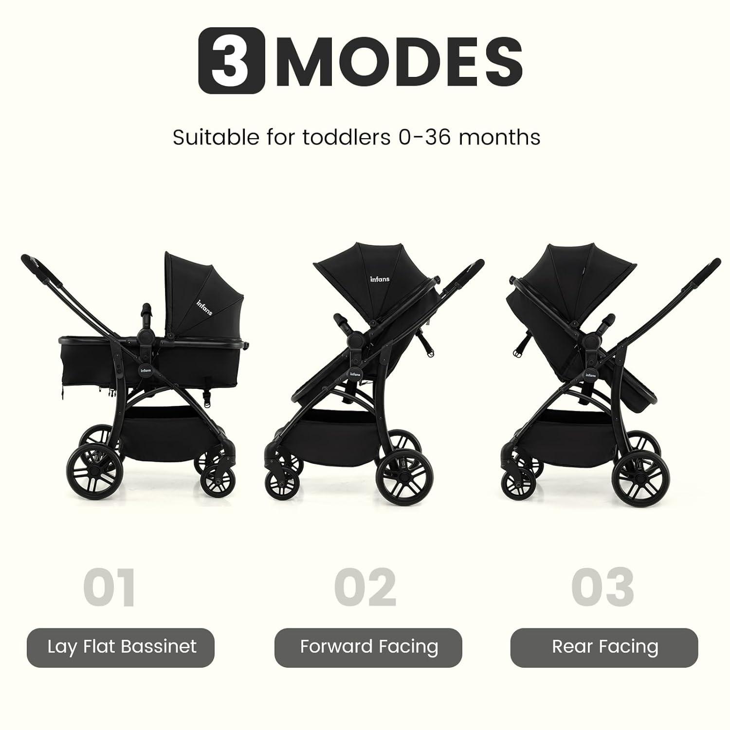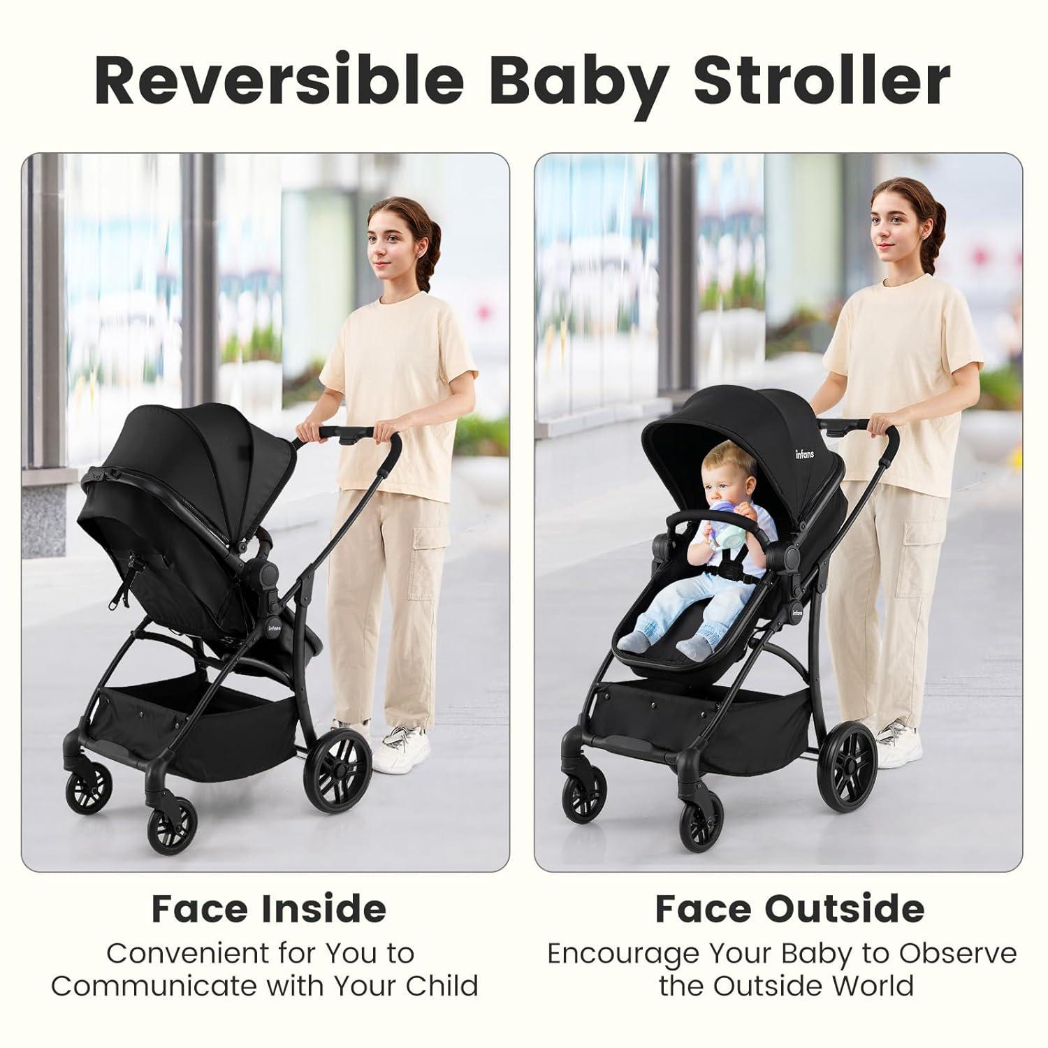 The compact stroller combines versatility and safety. The 2-in-1 design makes this INFANS toddler stroller both a stroller and a bassinet, with a reversible seat for dual-facing options. The one-hand fold, compact folding size, secure hook ensure convenient portability. As for mobility, the EVA shock-absorbing wheels and a one-touch brake guarantee stability on any terrain. Also the 360° rotating front wheels with lockable design adds extra smoothness. The 3-position adjustable UV canopy and 138° reclining backrest cater to naps or playtime. Crafted from breathable Oxford fabric, this coches para bebes includes a storage basket and supports up to 33 lbs/15kg.Ideal for newborns aged from 0 to 36 months.
