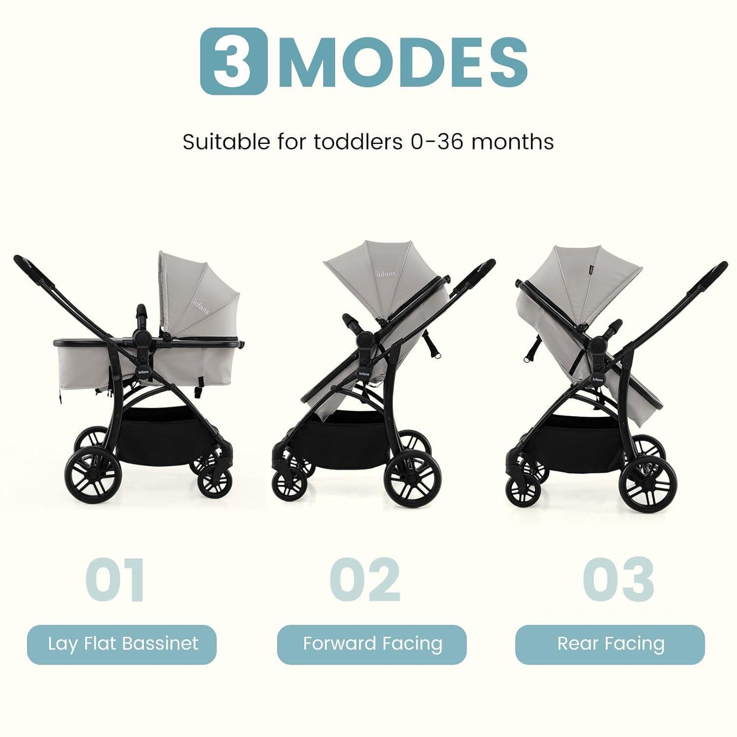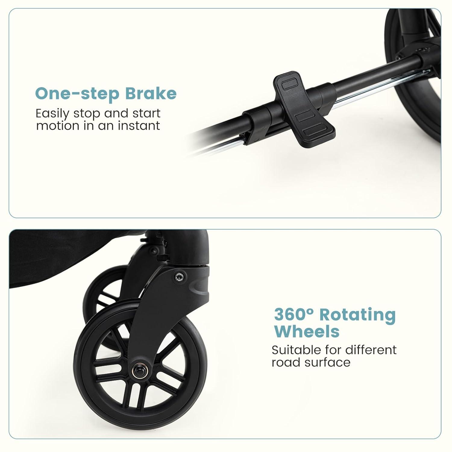 The compact stroller combines versatility and safety. The 2-in-1 design makes this INFANS toddler stroller both a stroller and a bassinet, with a reversible seat for dual-facing options. The one-hand fold, compact folding size, secure hook ensure convenient portability. As for mobility, the EVA shock-absorbing wheels and a one-touch brake guarantee stability on any terrain. Also the 360° rotating front wheels with lockable design adds extra smoothness. The 3-position adjustable UV canopy and 138° reclining backrest cater to naps or playtime. Crafted from breathable Oxford fabric, this coches para bebes includes a storage basket and supports up to 33 lbs/15kg.Ideal for newborns aged from 0 to 36 months.