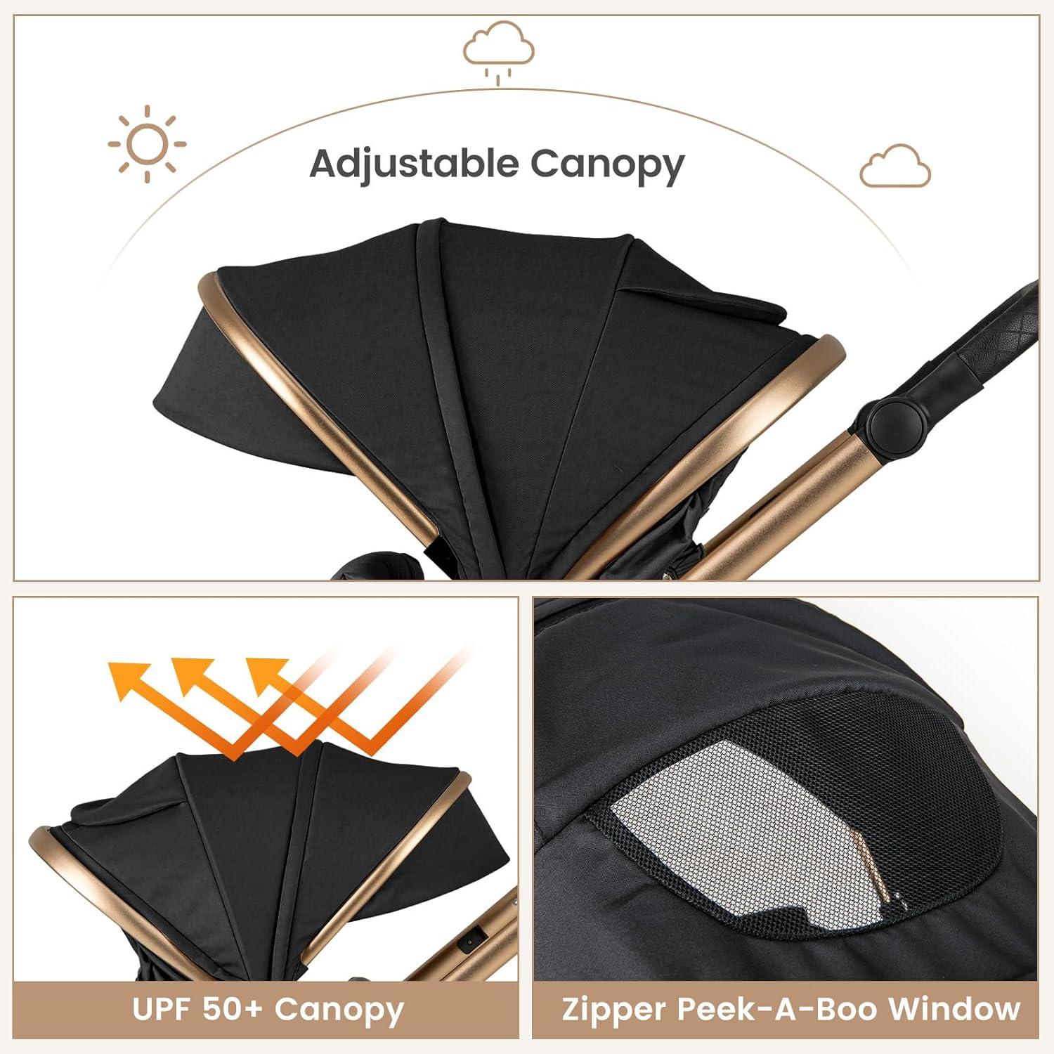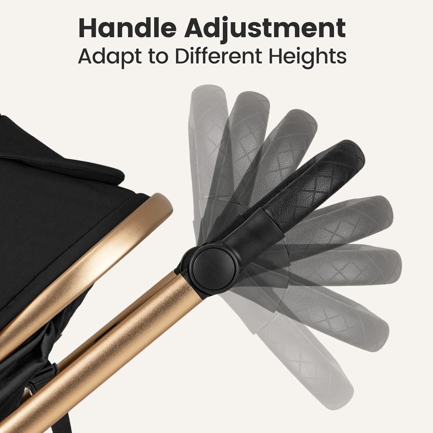 Customized Comfort Features:The handlebar angle can be adjusted in 9 gears, which not only provides a comfortable push experience but also suitable for parents of all heights. By adjusting the back, the baby bassinet can be divided into 3 modes: sitting, semi-reclining or sleeping mode, to meet the different needs of the baby.To protect kids from the sun or afternoon showers, the convertible travel stroller comes with a removable and 3 angle-adjustable UV protection canopy.