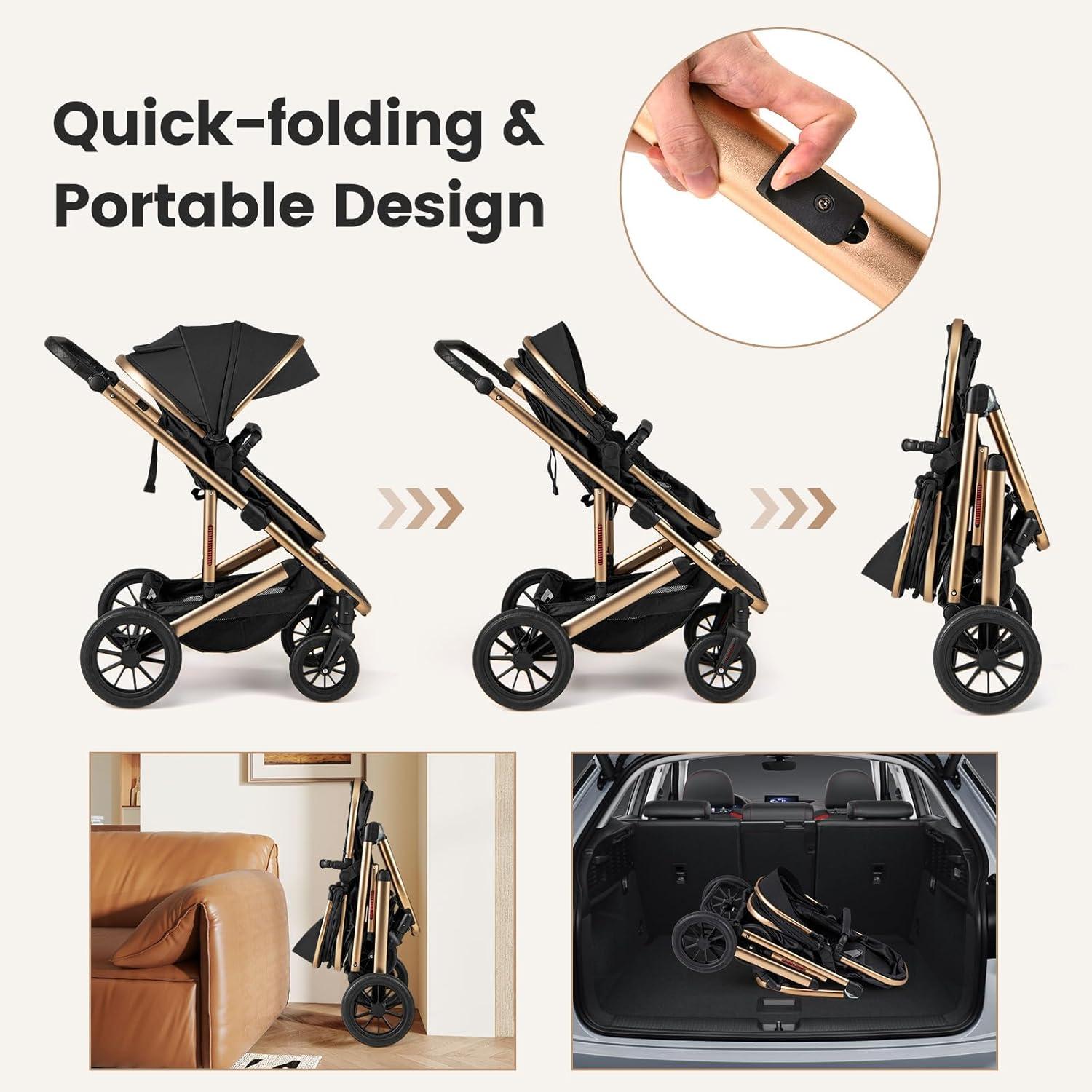 Portable Folding Design: This versatile baby stroller folds up easily with the push of a button on either side. Whether you're going on a family trip or at home, this stroller offers accessible folding and expansion. Unfolded Dimensions: 37.5″ X 23.4″ X 41.5″ (L x W x H); Folded Dimensions: 20” x 22” x 36” (L x W x H)