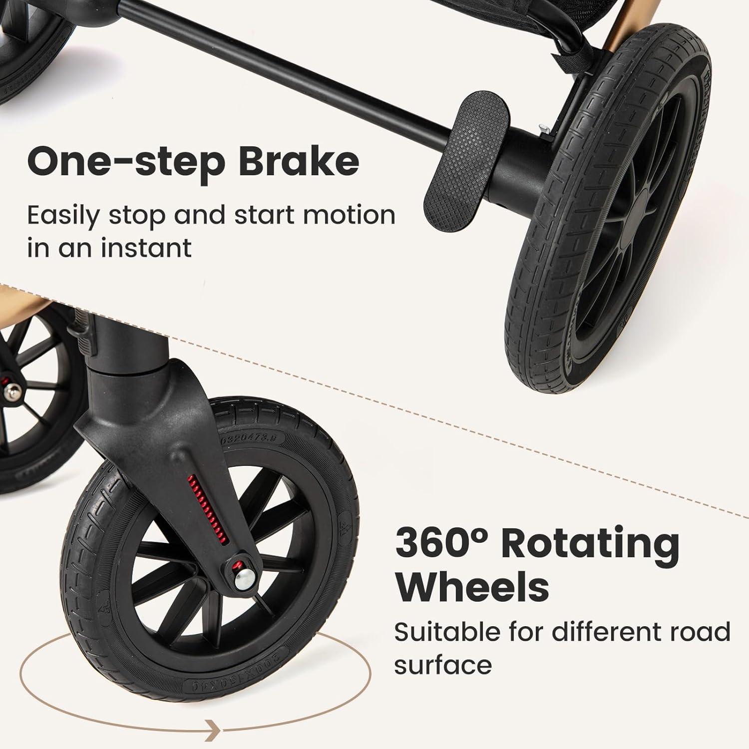 Smooth Driving, Safety First: The wheels are quick inserts, quick and easy to install and disassemble. Glide through any terrain with ease thanks to the shock-absorbing Lockable universal front wheels and rear wheels with a one-step brake system. Enjoy a steady and smooth ride while the five-point safety harness provides extra safety for children.