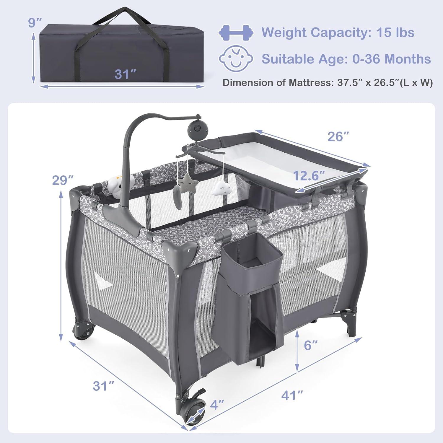 Multi-functional Baby Crib: The 3-in-1 infant crib can be used as a playpen, bassinet and changing table. The crib comes with a side bag for diaper. The versatile design provides convenience and practicality for parents, while the kids playpen accompanies your baby’s growth. (Suitable Mattress Pad's Size: 37.5”L x 26.5”W)