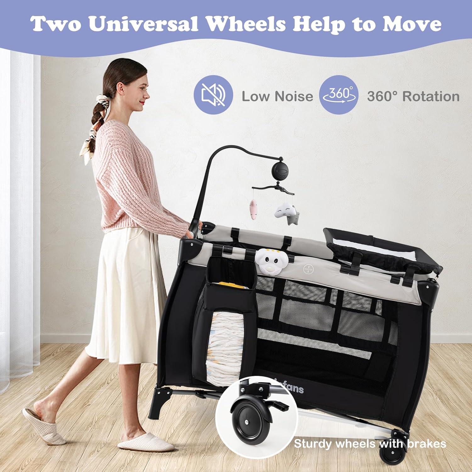 INFANS 3 in 1 Pack and Play, Portable Travel Baby Crib Bassinet with Detachable Mattress, Newborn Changing Table, Foldable Playpen with Carry Bag and 2 Wheels (Cartoon)(Classic)