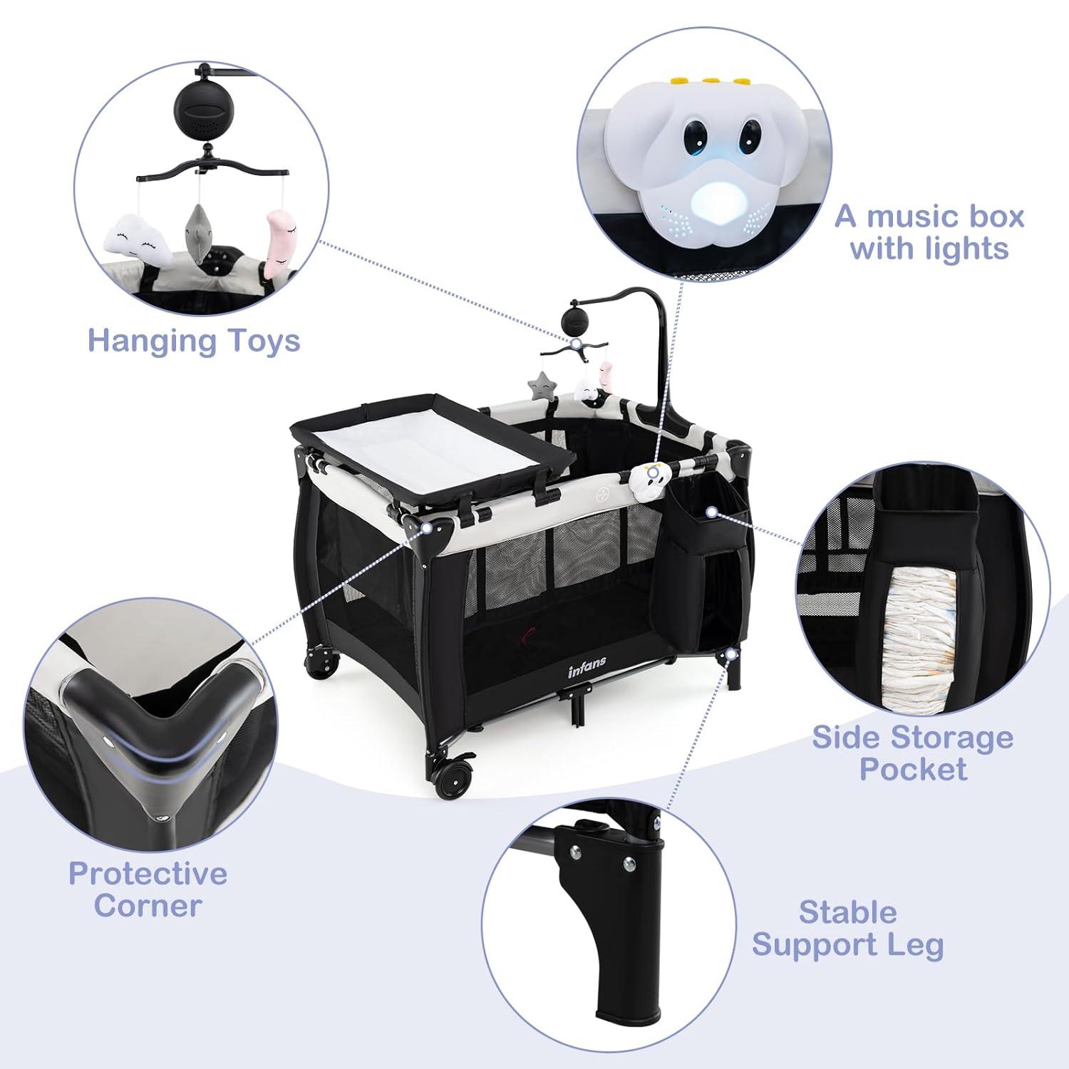 INFANS 4 in 1 Pack and Play, Portable Nursery Center for Baby Kid Infant, Travel Playard with Bassinet, Mattress, Diaper Changer, Bag, Toys, Music Box, Storage Basket (Cow)(Cow)