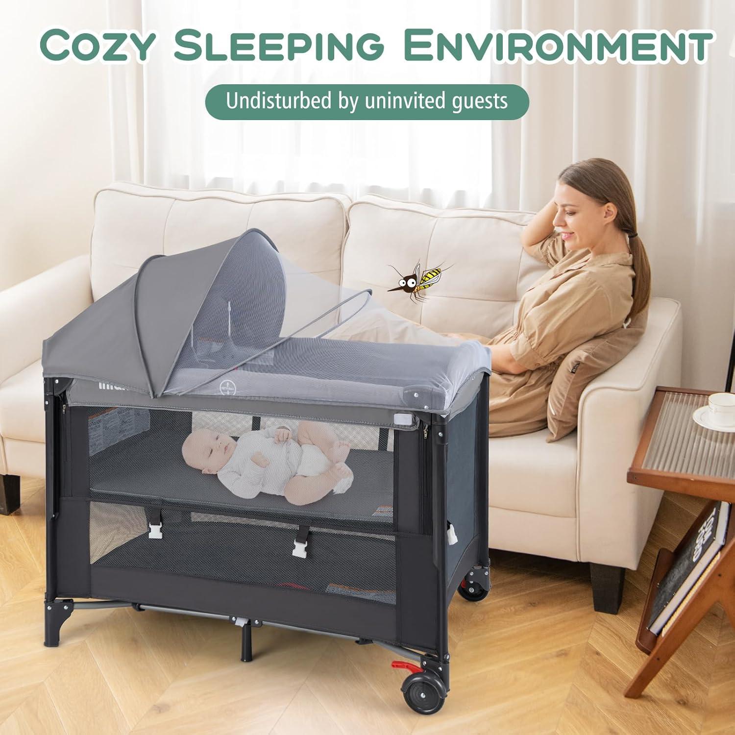 Comfortable Sleeping Space: The INFANS baby bed comes with a soft mattress to ensure the baby sleeps more comfortably. The unique thickened design provides better protection for the baby's spine. Additionally, the baby crib features with an adjustable canopy that effectively blocks out bright light and mosquitoes. The fully breathable mesh design allows parents to observe the baby more conveniently (Mattress size: 36.5″ long x 24.5″ wide)