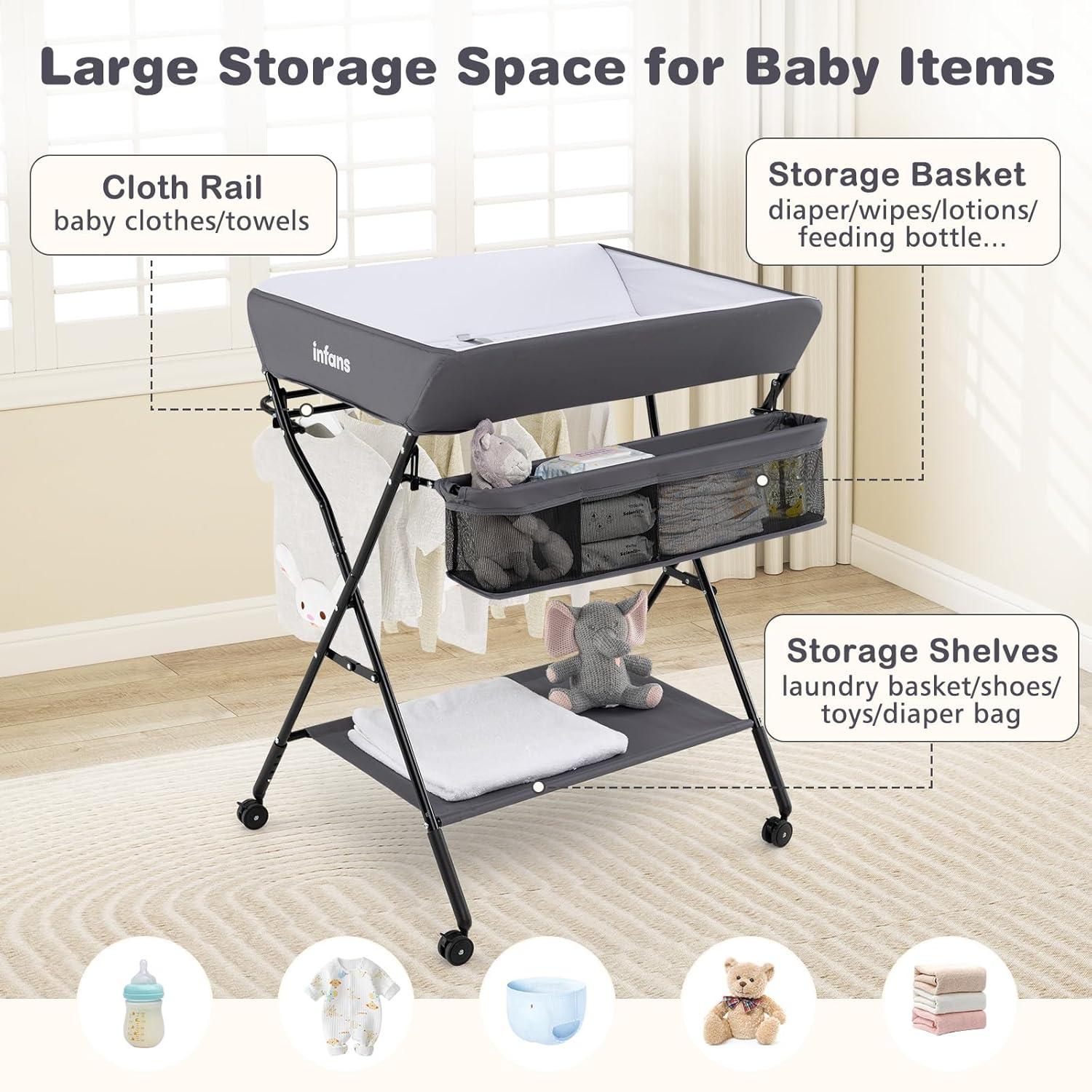 imageINFANS Baby Changing Table with Wheels Portable Folding Diaper Station Nursery Organizer with Storage Basket Hanging Rack Adjustable Height Safety Belt for Newborn Infant GrayBlack
