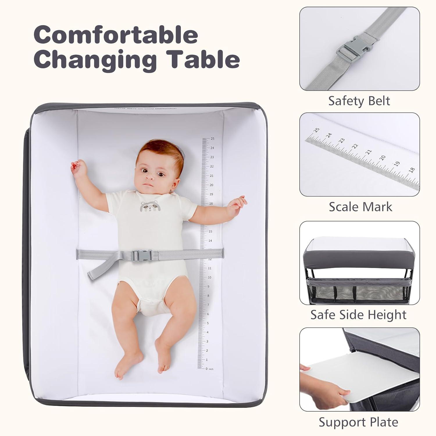 Premium Safety Material: The changing table stand features a sturdy X-shaped frame design for increased stability. Meanwhile, the 4-side protective cloth panels and safety belt provide absolute security for babies. Additionally, it uses safe and skin-friendly fabric ensure the baby's comfort. The table top surface is made of waterproof and smooth PVC material, which is easy to clean and maintain hygiene