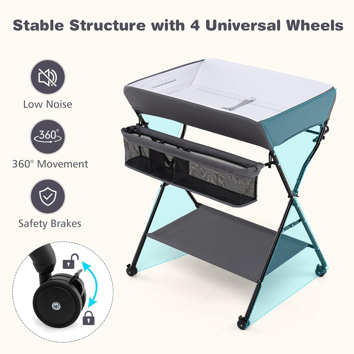 360°Lockable Wheels: The mobile nursery for newborn comes with 4 lockable silent swivel wheels to prevent the changing table from sliding and to ensure safe usage