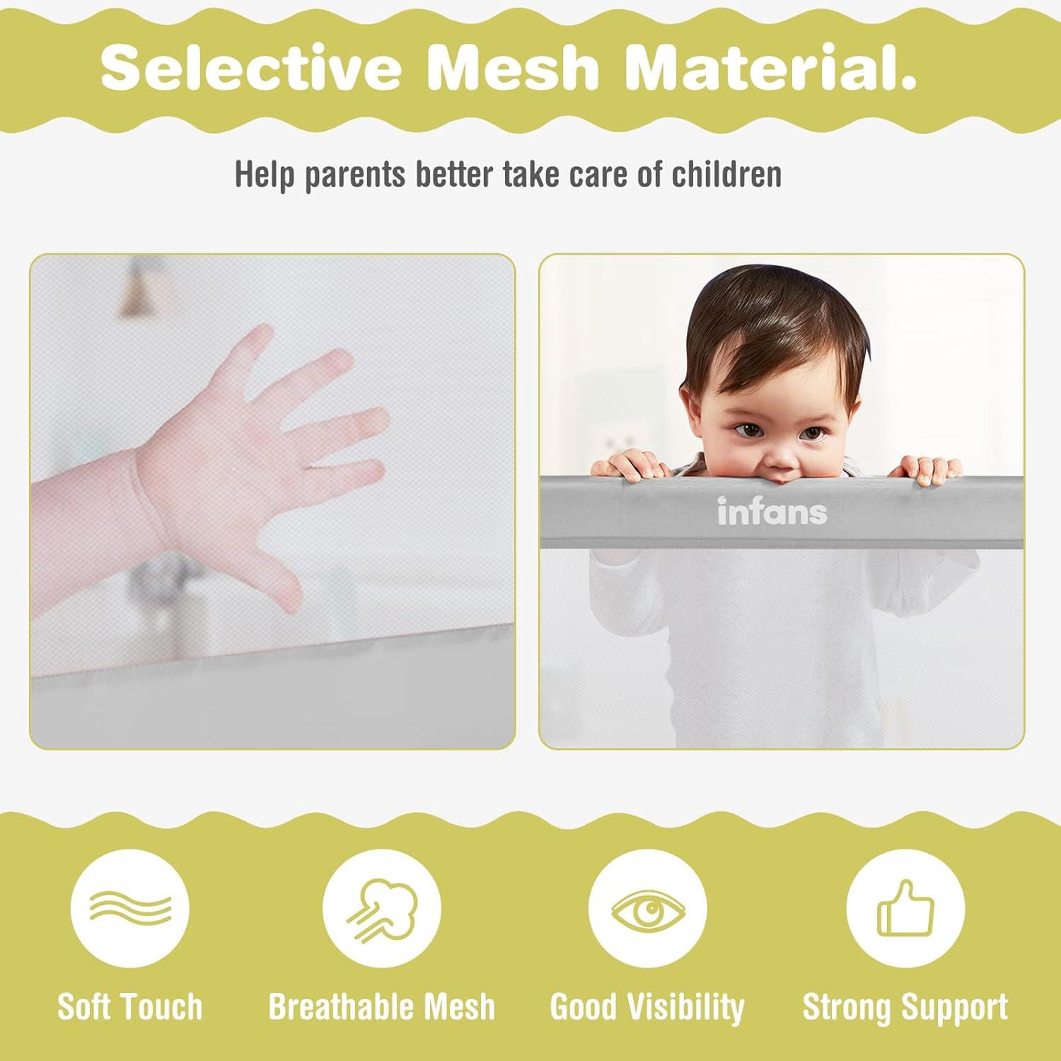 Premium Quality Materials: The bedside guardrail is made of selected safe and skin-friendly fabric that is bite-resistant for children, with a zippered cover design for easy removal and cleaning. The high elasticity and breathable mesh not only protect children but also allow parents to monitor their baby's every move. All materials meet safety standards and provide a safe sleeping environment