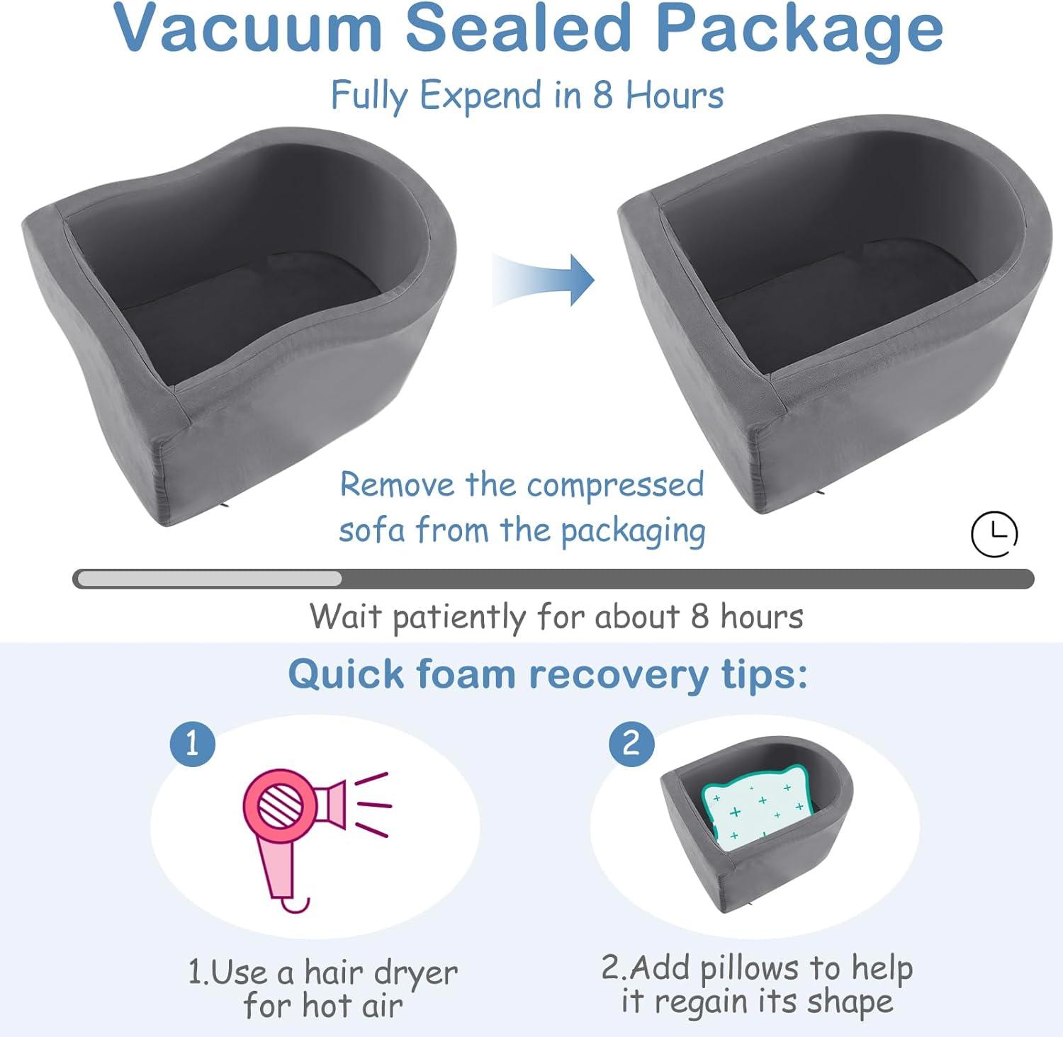 NOTE: As the product material is made of high density sponge, vacuum compression packaging. Once the kid's couch set is opened, please wait 24-48 hours for the sponge to bounce back before using. If after 48 hours, found that the fabric of the product is wrinkled, using steam ironing can restore the fabric smooth.