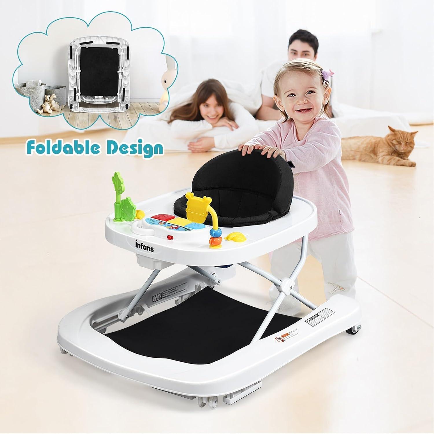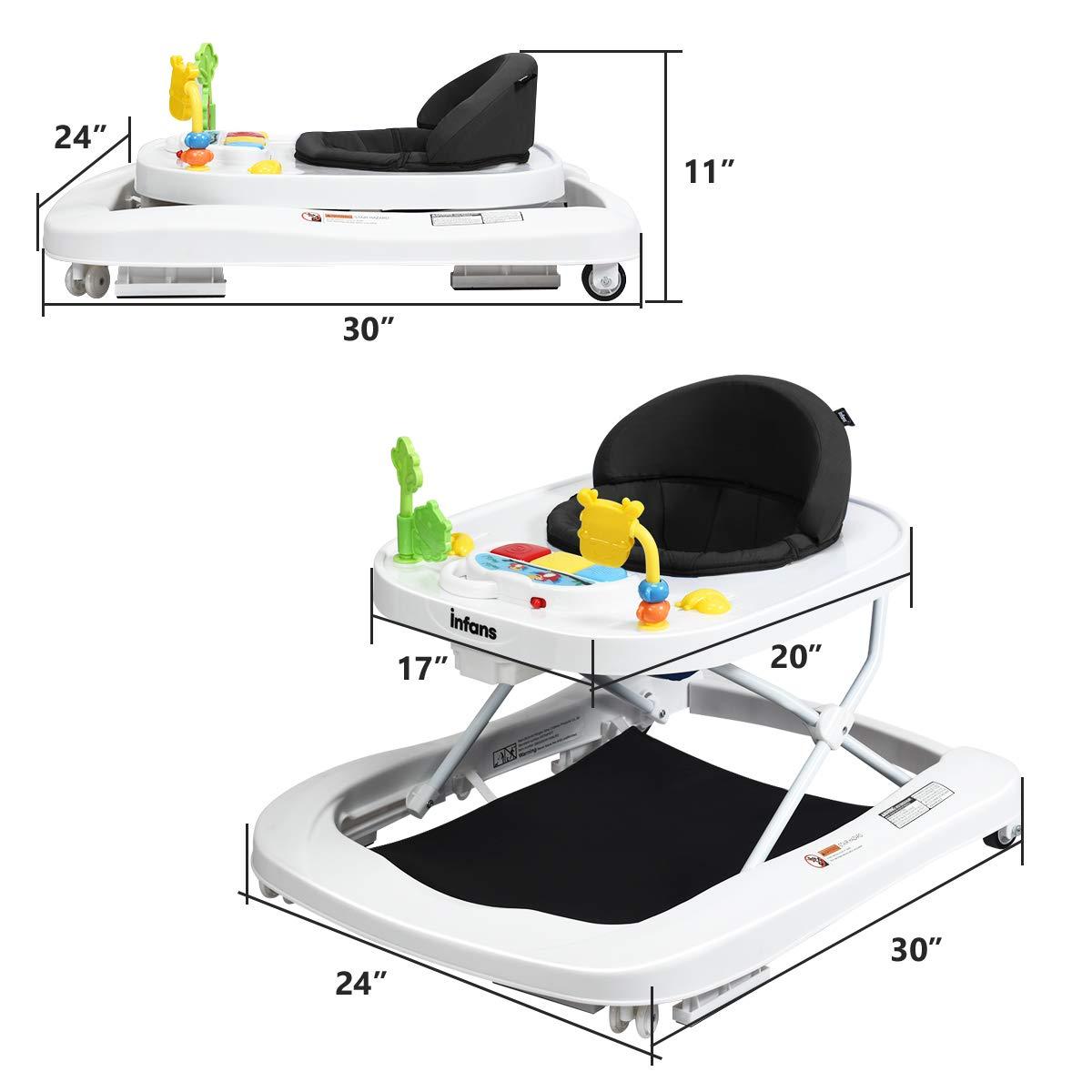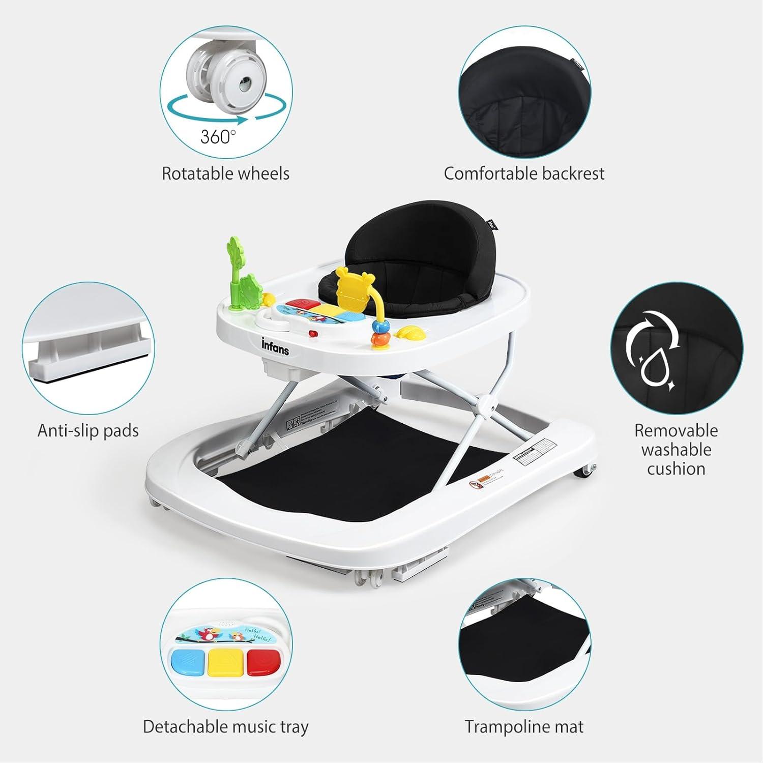 INFANS Foldable Baby Walker, 3 in 1 Toddler Walker Bouncer, Learning-Seated, Walk-Behind, Music, Adjustable Height, High Back Padded Seat, Detachable Trampoline Mat, Activity Walker with Toys (Black)(Black)