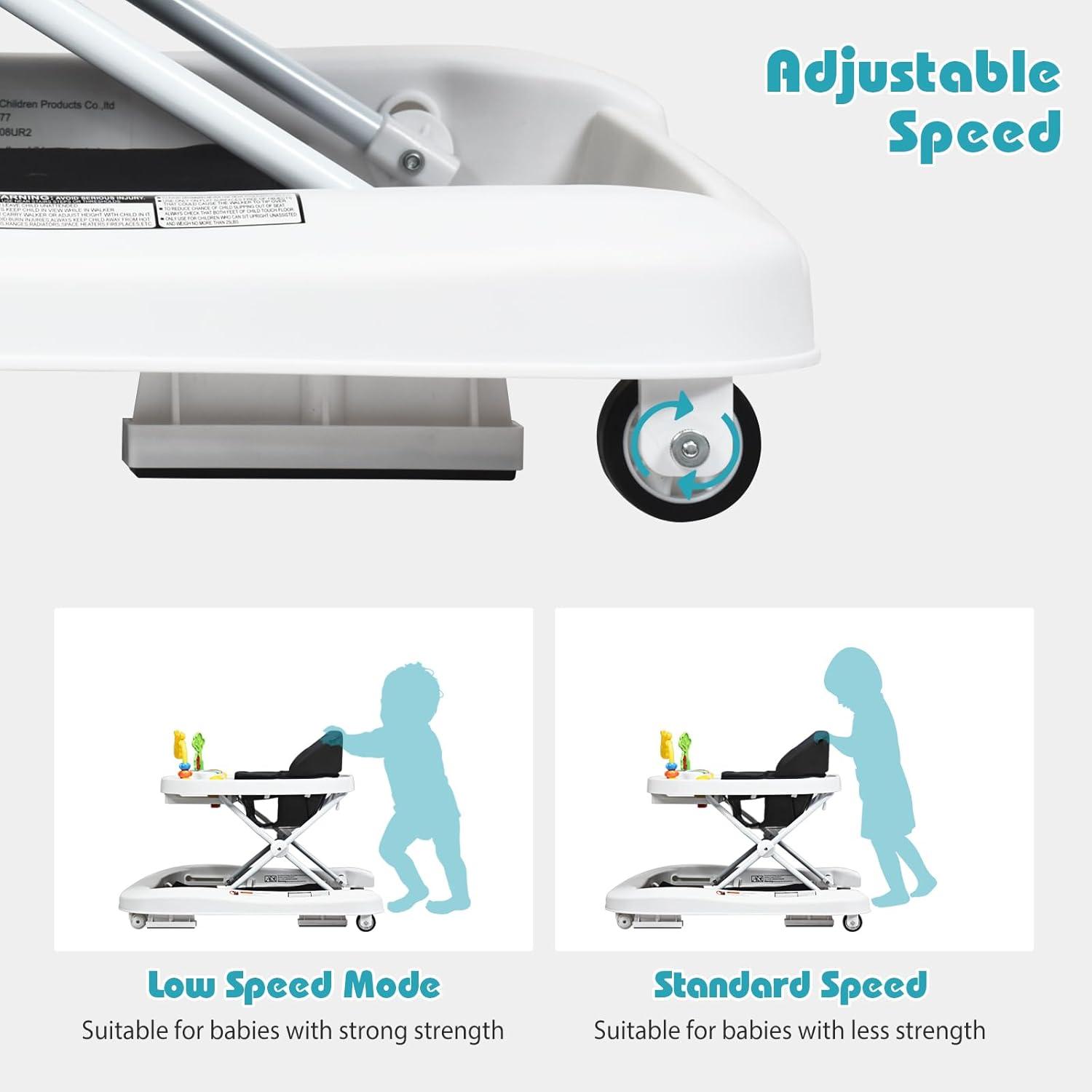 3-Position Height & Adjustable Speed:The 3-position adjustable height of the walker is perfect for boys and girls. The rear wheels of the walker are fixed with nut and you can tighten the screw to increase the friction to control the speed of the baby walker