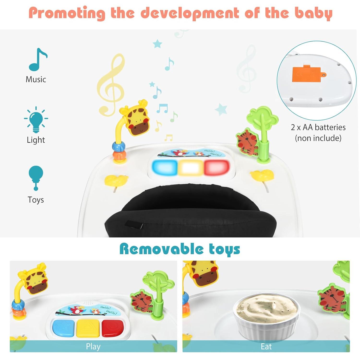 Activity Center & High Back Seat: Detachable music box gives baby various music enjoyment and early enlightenment. It’s so nice seeing your babies explore their new toys! Besides, the seat cover is detachable for easily cleaning up. The breathable seat cover will let your baby enjoy the comfortable experience. The thicker and higher seat back provides support and comfort