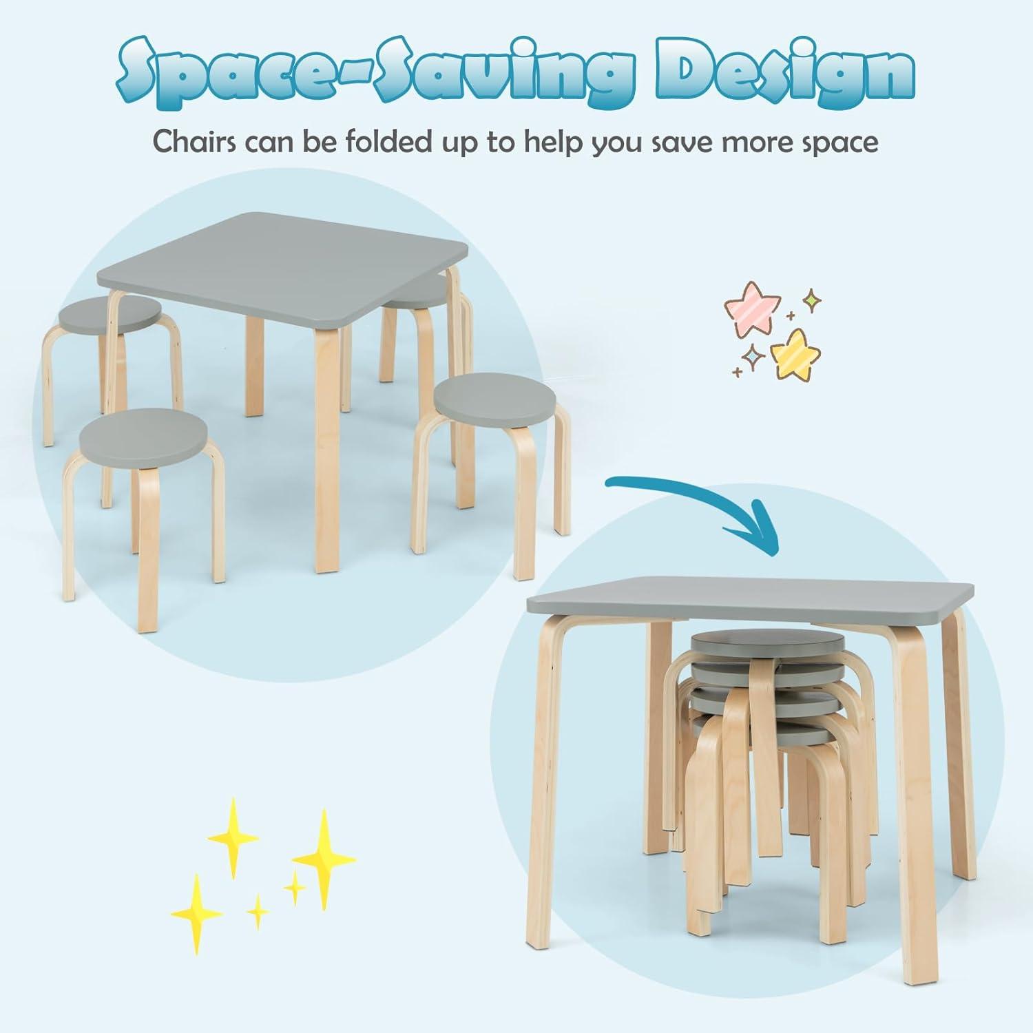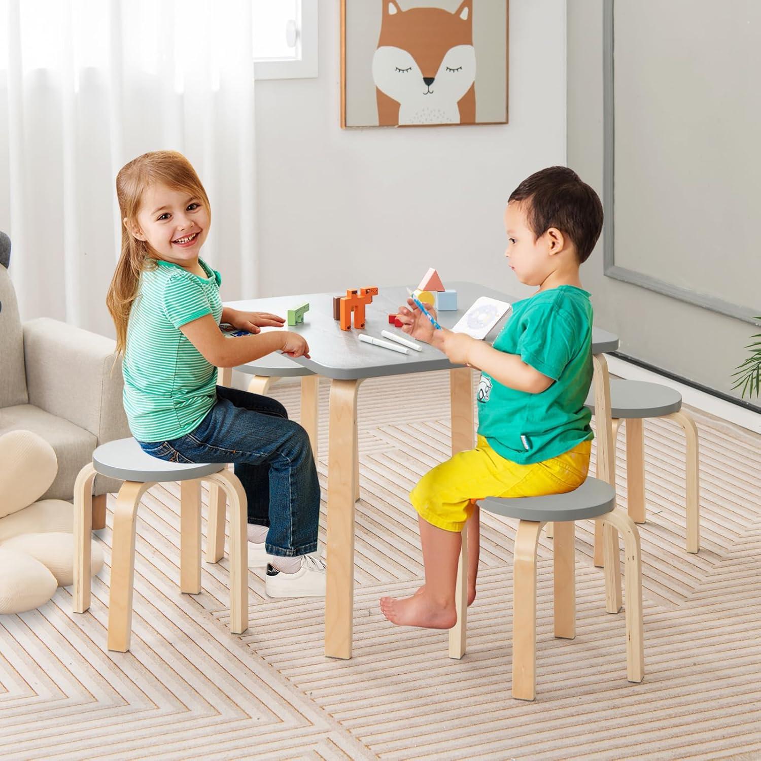 INFANS Kids Wooden Table and Stool Set, 5-Piece Activity Table with 4 Stools for Toddler Building Block Drawing Reading Art Crafts, Children Natural Furniture Set for Kindergarten Classroom(Grey)