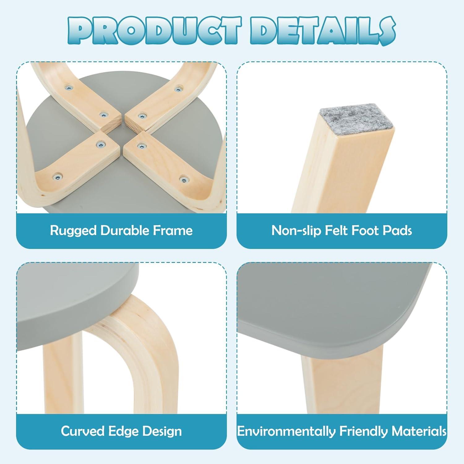 INTIMATE DETAIL DESIGN: In order to protect the safety of the baby, prevent scratches and bruises, the table and stool edge is round. When not in use, stools can be stacked together under the table to save storage space. Furthermore, felt footpads at the bottom enhance overall stability while protecting the floor from scratches.