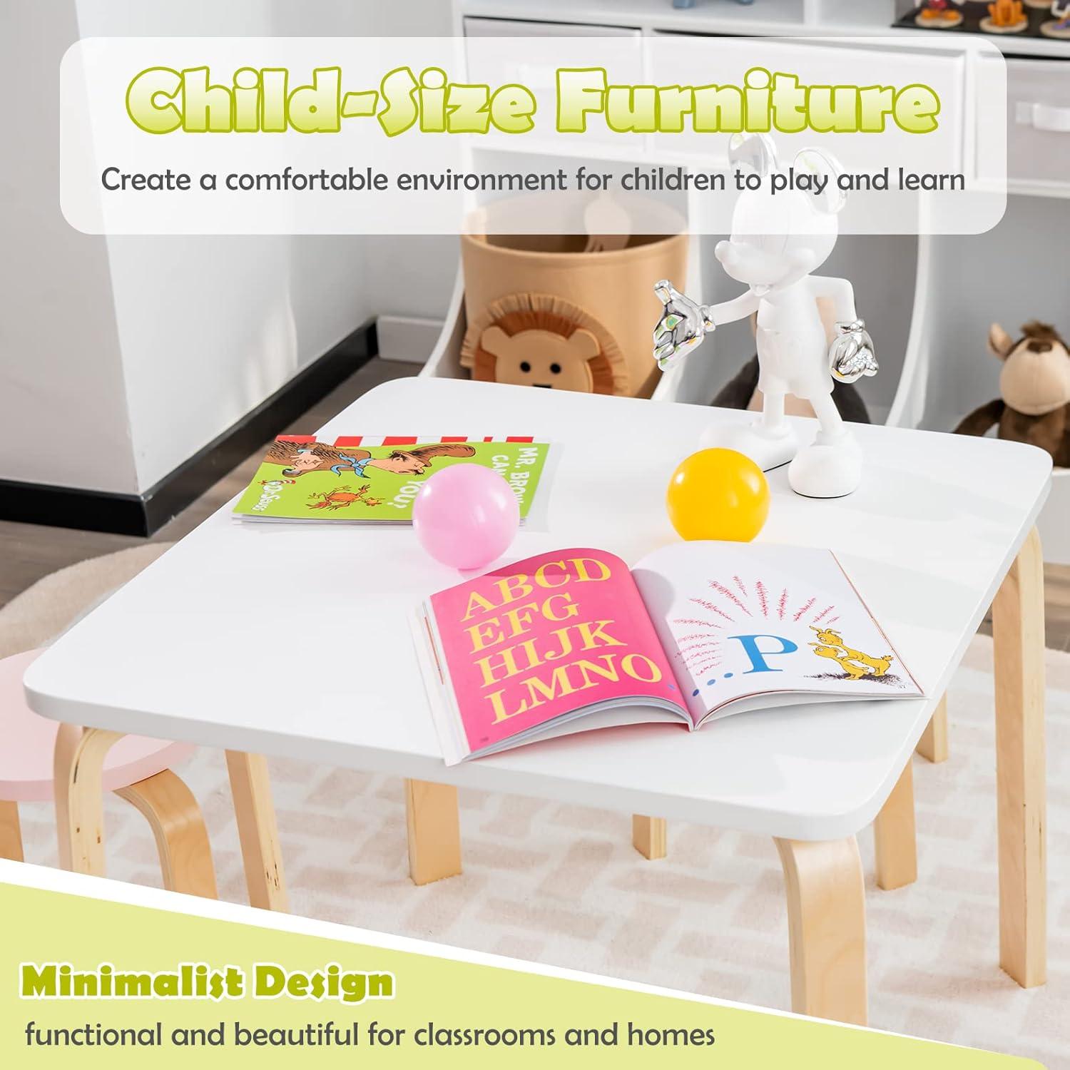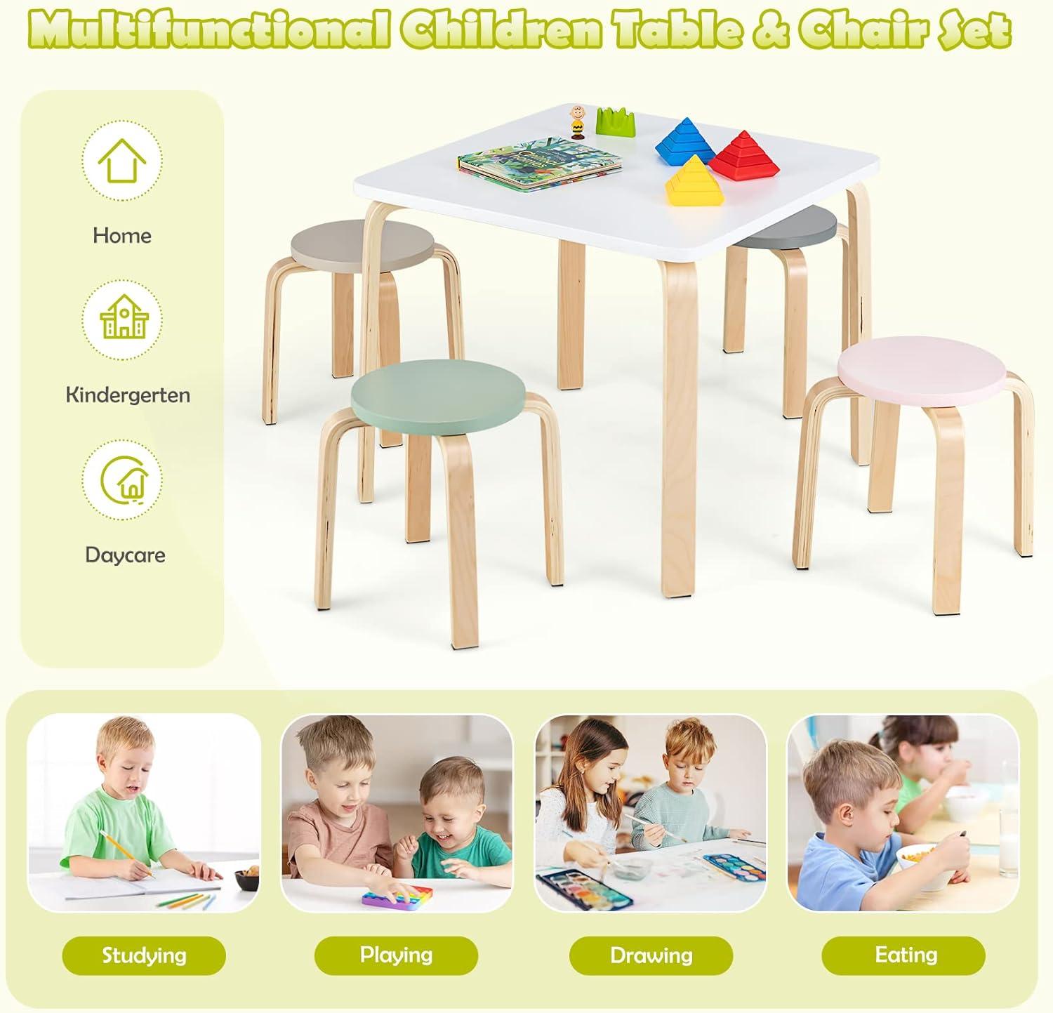 INFANS Kids Wooden Table and Stool Set, 5-Piece Activity Table with 4 Stools for Toddler Building Block Drawing Reading Art Crafts, Children Natural Furniture Set for Kindergarten Classroom(Macaron)