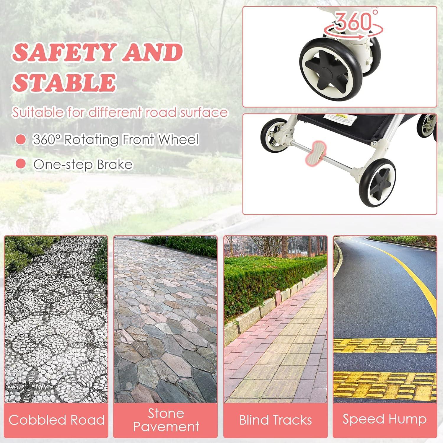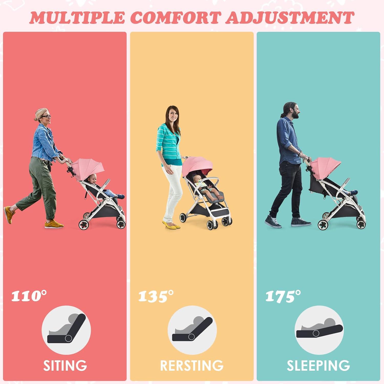 COMPACT STROLLER FOR TRAVEL: INFANS Lightweight Baby Stroller weighs 14.4 pounds and is only 23.6 “x 20.5″ x 9.8” when folded, and can be easily stowed in the trunk of your car or carried on an airplane while traveling. Also, extra pull rods make it easy for mom to carry this lightweight stroller anywhere.