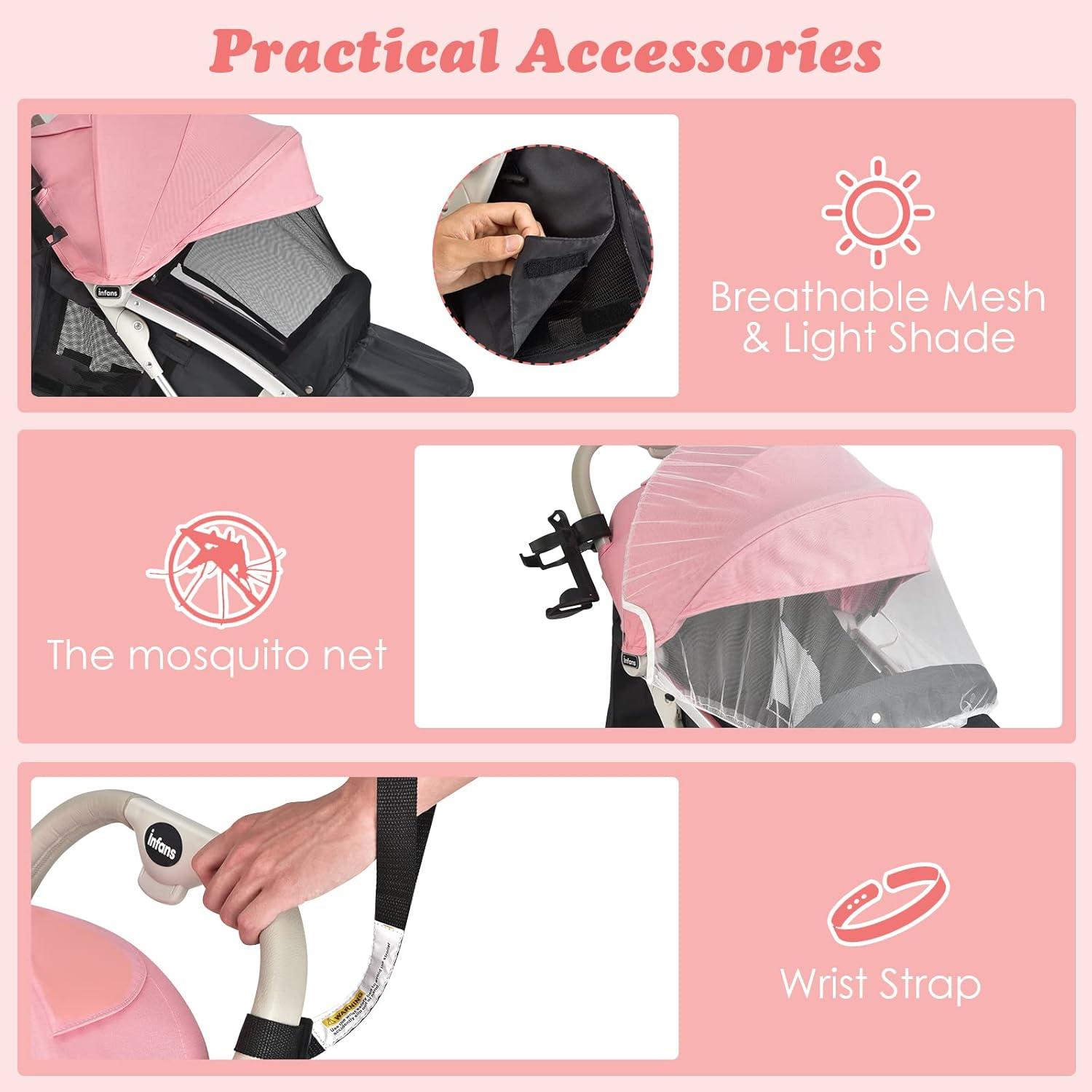 INFANS Lightweight Baby Stroller, Compact Infant with One-Hand Fold, Travel Stroller for Airplane with Cup Holder, Canopy 5-Point Harness Foot Cover for 0-36 Month(Pink)