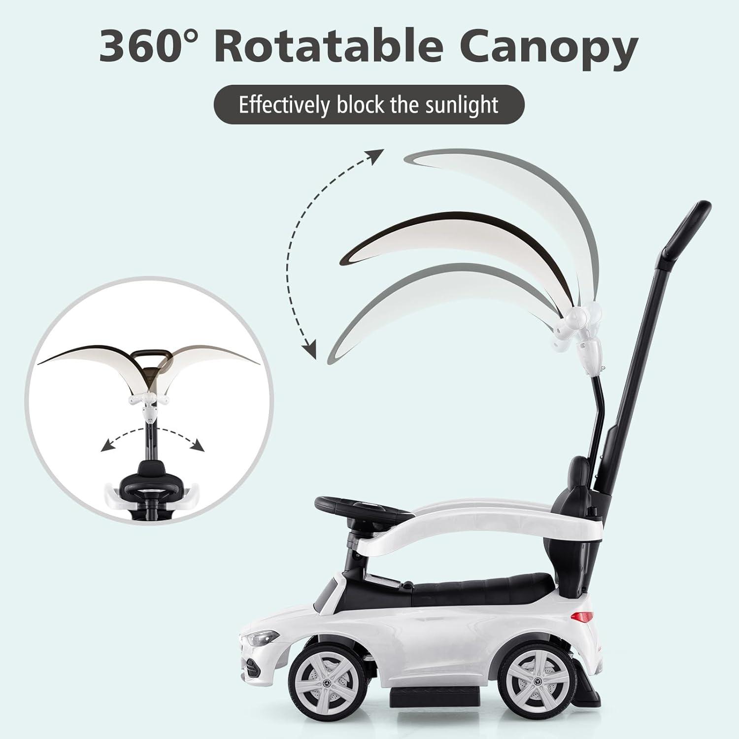 This licensed Mercedes-Benz 3-in-1 ride on push car comes in three different configurations, including a baby push car, a walking car and a ride on car, allowing parents to customize it according to their children's needs and adapt it as the children grow. The toddler siding car is also equipped with convenient features, such as an adjustable canopy, a large hidden storage basket, handlebar hooks, a horn and built-in music. If you are still worrying about finding gifts for your children, this is a perfect choice